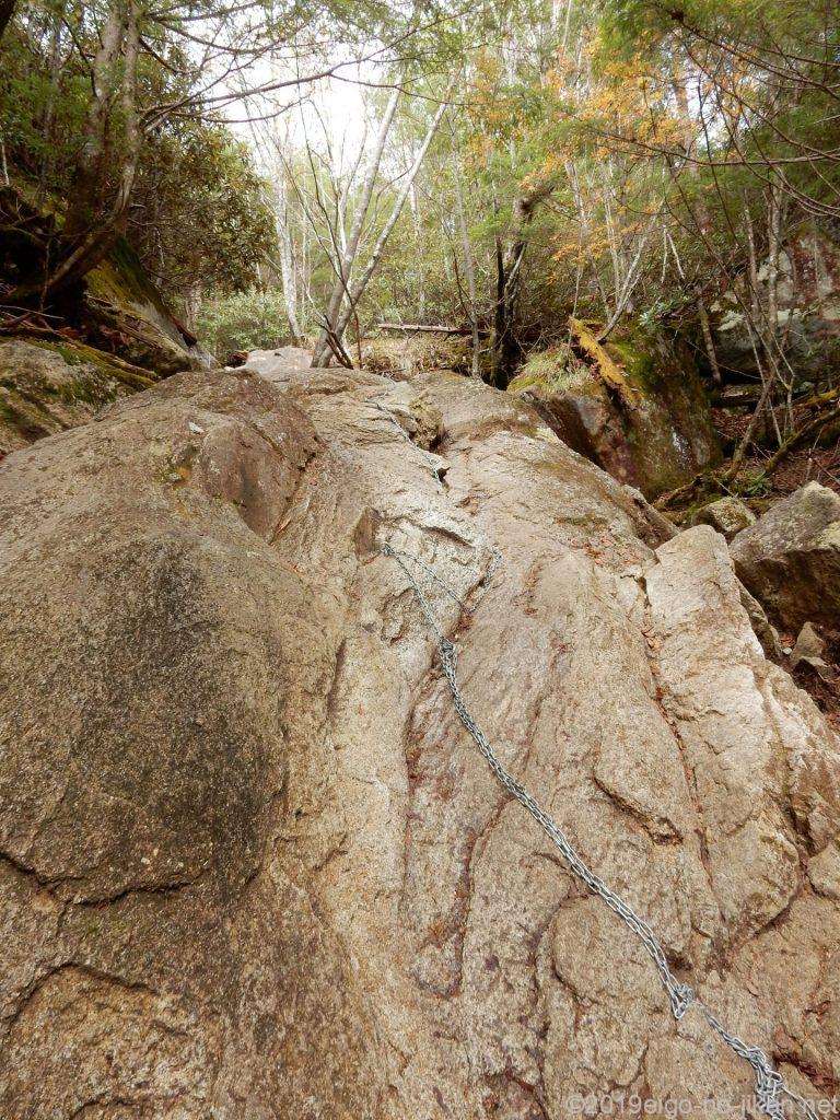 しばらく沢沿いを登って行きます。こんな鎖場もあります。足場や手がかりは多いので鎖がなくても登れますが、岩が滑りやすいときや下りでは重宝します。