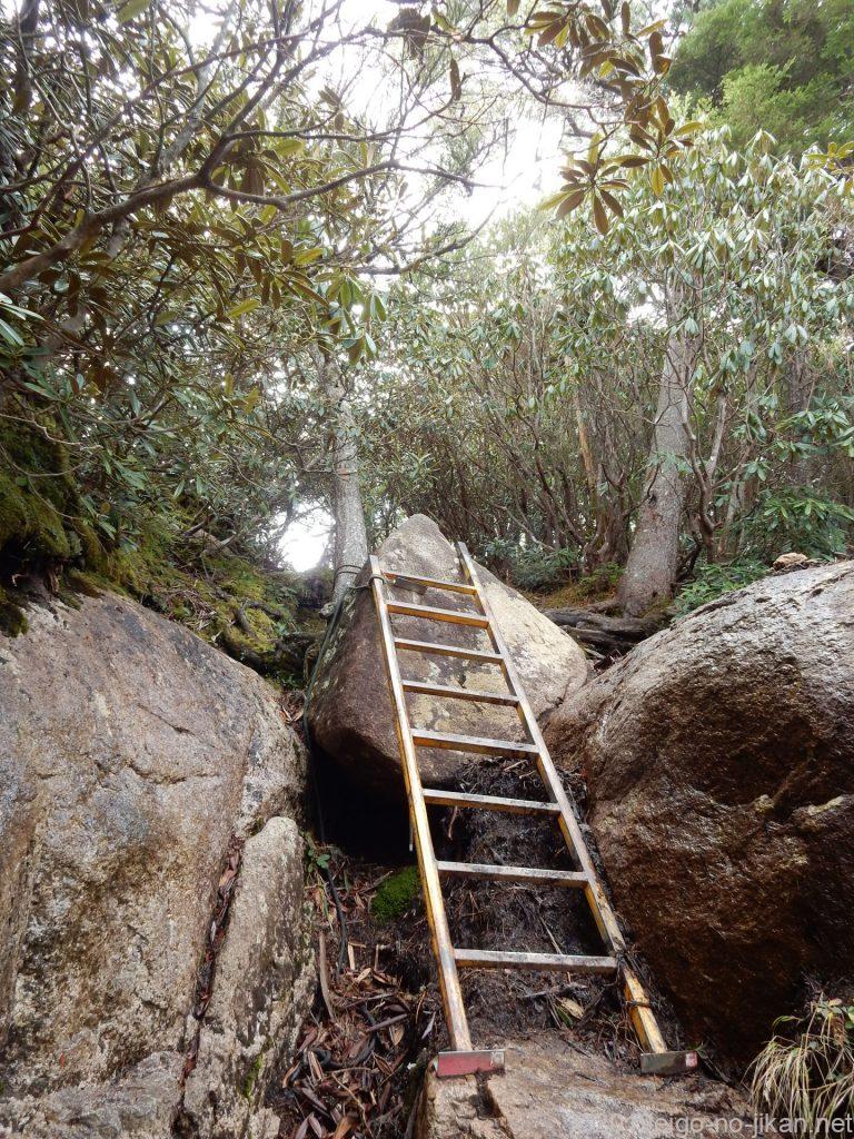 シャクナゲも多くなってきます。この梯子を登れば頂上はすぐ。